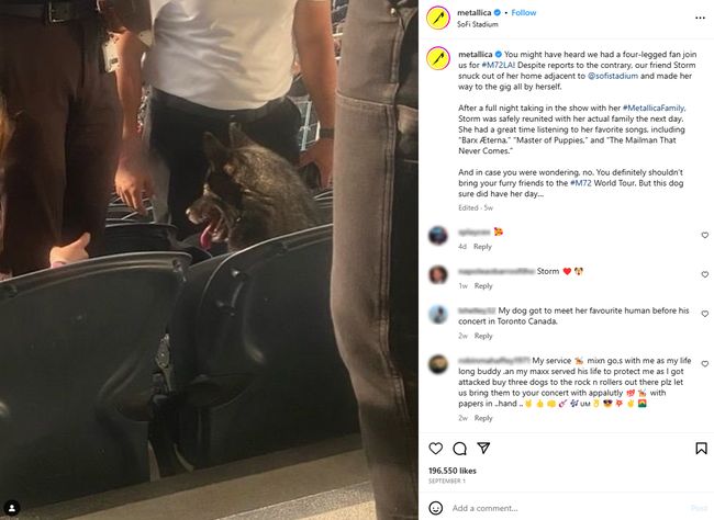"สตอร์ม" น้องหมาสายพันธุ์เยอรมันเชพเพิร์ดผสม เพิ่งจะสร้างความประหลาดใจให้กับผู้คนและนายรักของเธอ หลังแอบย่องออกจากบ้านไปอย่างเงียบ ๆ ก่อนทำเนียนไปโผล่บนที่นั่งผู้ชมในคอนเสิร์ตวงร็อกชื่อดัง Metallica ที่ถูกจัดขึ้น ณ SoFi Stadium เมืองลอสแองเจลิส รัฐแคลิฟอร์เนีย ประเทศสหรัฐอเมริกา เมื่อวันที่ 25 สิงหาคมที่ผ่านมา