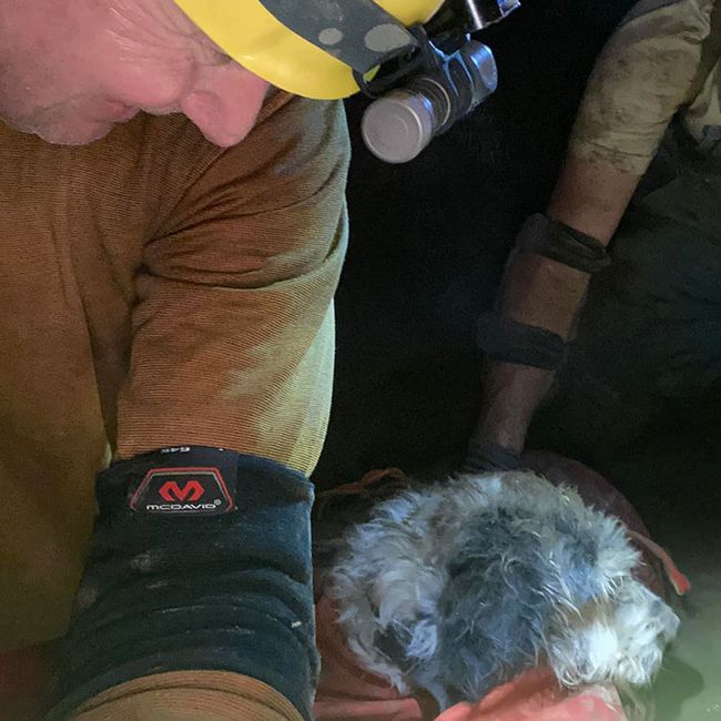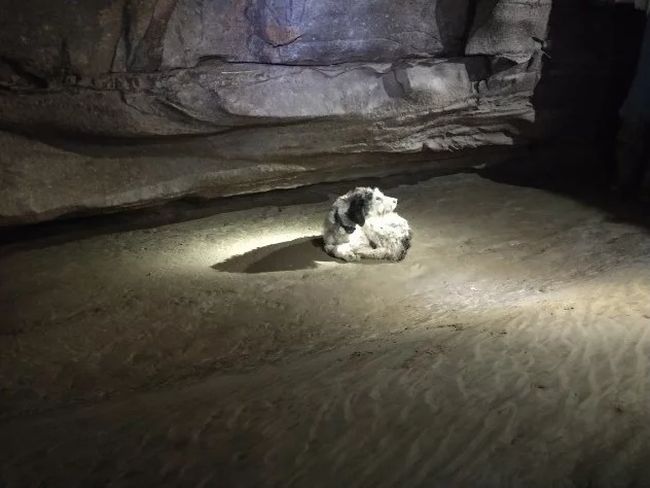 สิ่งที่ทีมนักสำรวจพบคือสิ่งมีชีวิตตัวน้อยลักษณะคุ้นตาที่ไม่มีทางเป็นไปได้เลยว่าจะสามารถพบได้ ณ โถงถ้ำใต้ดินที่ลึกกว่า 152 เมตร! เธอคือน้องหมาผู้น่าสงสารที่กำลังสับสนและดีใจอย่างที่สุด หลังจากที่ได้ยินเสียงเพื่อนมนุษย์และแสงไฟส่องสว่างพุ่งตรงเข้าไปหา แววตาของน้องหมาเริ่มเปล่งประกายและเต็มไปด้วยความหวัง ถึงแม้ในตอนนั้นเธอจะแทบไม่มีแรงพยุงตัวเองให้ลุกขึ้นยืนได้ก็ตาม