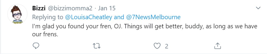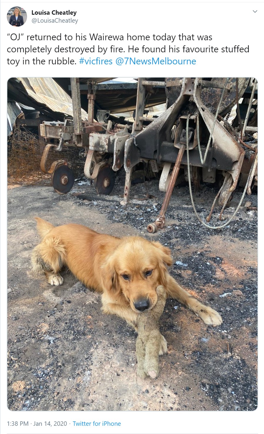 “ลูอิสซา ชีทลีย์” (Louisa Cheatley) ผู้สื่อข่าวของ 7News ได้บันทึกภาพเหตุการณ์ที่น่ารักทั้งหมดนี้เอาไว้ได้ น้องหมาโอเจเป็นผู้ค้นพบเพื่อนตุ๊กตาตัวโปรดของเขาด้วยตัวเอง ซึ่งสิ่งที่ลูอิสซาสัมผัสได้นั้นก็คือ โอเจกำลังมีความสุขมากๆ เมื่อรู้ว่าเพื่อนรักยังอยู่และปลอดภัยดี โอเจคาบตุ๊กตามานั่งเล่นบนกองเถ้าถ่าน ท่าทางที่น่ารักนั้นช่วยทำให้คุณพ่อคุณแม่ผู้เป็นนายของเขามีรอยยิ้มแสดงบนใบหน้าได้บ้างขณะที่สภาพจิตใจกำลังย่ำแย่เศร้าเสียใจกับสิ่งที่ต้องสูญเสียไปกับไฟป่าในครั้งนี้...