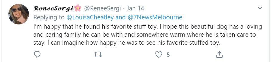 “ฉันดีใจและมีความสุขมากที่ได้เห็นเขาพบของเล่นชิ้นโปรดอีกครั้ง ฉันหวังว่าน้องหมาที่น่ารักตัวนี้จะได้รับความรักและการเอาใจใส่จากครอบครัวในสถานที่ที่อบอุ่น ฉันจินตนาการได้เลยว่าเขากำลังมีความสุขมากขนาดไหนตอนที่เขาได้เห็นตุ๊กตาตัวโปรดของเขาอีกครั้ง”