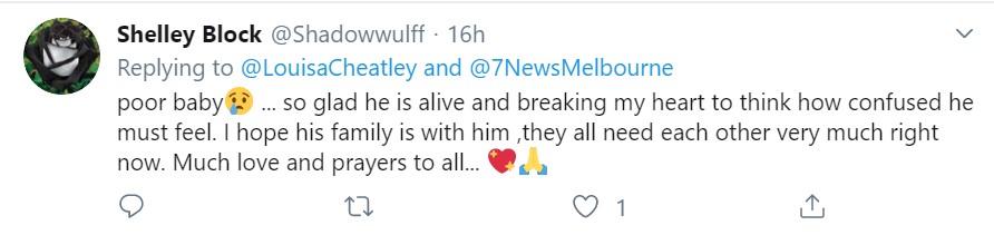 “โถเด็กน้อยที่น่าสงสาร...ฉันยินดีด้วยนะที่เพื่อนของนายยังมีชีวิตรอด แต่หัวใจของฉันก็แทบแตกสลายเมื่อจินตนาการว่าเขาคงรู้สึกสับสนกับเหตุการณ์นี้มากขนาดไหน ฉันหวังว่าครอบครัวนี้จะยังดูแลเขาได้ตลอดไป พวกเขาต้องการความรักจากกันและกันมากที่สุดในตอนนี้ ฉันขอสวดภาวนาให้ทุกๆ คน”