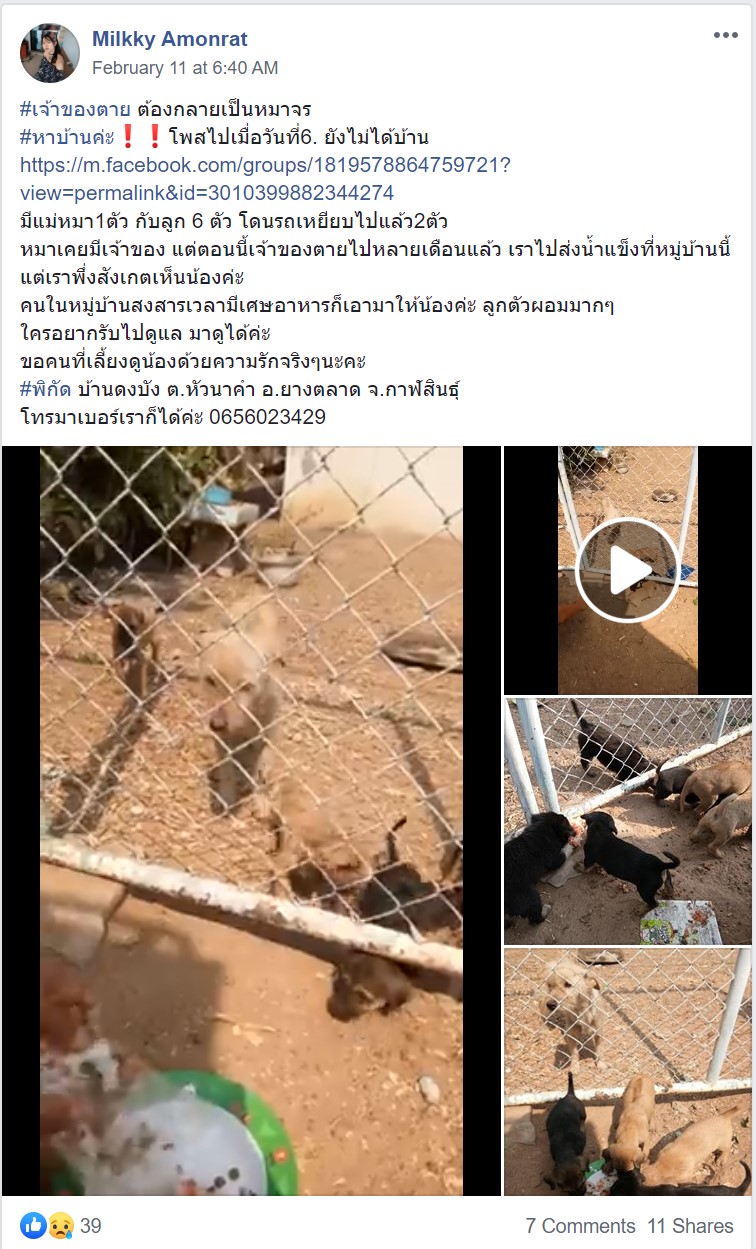 เมื่อวันที่ 11 กุมภาพันธ์ 2563 ที่ผ่านมา ผู้ใช้งานเฟซบุ๊กชื่อ “Milkky Amonrat” ซึ่งทราบชื่อจริงภายหลังคือ “คุณมิลค์” ได้โพสต์ข้อความประกาศตามหาบ้านหลังใหม่ที่พร้อมจะดูแลแม่หมาและลูกๆ หมาตัวน้อยที่มีสภาพร่างกายผอมโซ รวม 7 ชีวิต ลงในกลุ่ม Dog's Clip Village ซึ่งมีข้อความระบุว่า