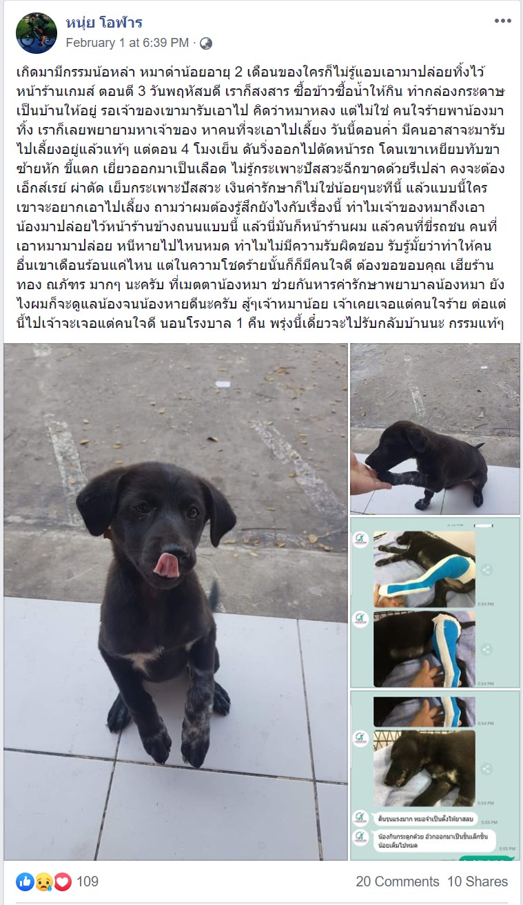เมื่อวันที่ 1 กุมภาพันธ์ 2563 ที่ผ่านมา ผู้ใช้งานเฟซบุ๊กชื่อ “หนุ่ย โอฬาร” ทราบชื่อจริงภายหลัง “คุณหนุ่ย” ได้โพสต์ข้อความบนหน้าเฟซบุ๊กส่วนตัว บอกเล่าเหตุการณ์น่าเศร้า เมื่อน้องหมาตัวน้อยวัยเพิ่ง 2 เดือน เพศเมีย ขนสั้นสีดำ สายพันธุ์ไทย ถูกนำมาปล่อยทิ้งเอาไว้บริเวณข้างถนนหน้าร้านอินเทอร์เน็ตคาเฟ่ “Dsport” ของตน ที่ตั้งอยู่บริเวณซอยเบญจางค์ หลังวิทยาลัยเทคนิคอุดรธานี ตำบลหมากแข้ง อำเภอเมืองอุดรธานี จังหวัดอุดรธานี ตั้งแต่ช่วง 3.00 นาฬิกา ของวันที่ 27 มกราคม 2563 ด้วยสงสารจึงช่วยหาบ้านแต่ทว่าเคราะห์ตัดโอกาสน้องหมาถูกรถทับเจ็บหนักก่อนย้ายเข้าบ้านหลังใหม่ คุณหนุ่ยยื่นมือเข้าช่วยเร่งพาน้องหมาส่งคลินิกให้สัตวแพทย์ช่วยรักษา...